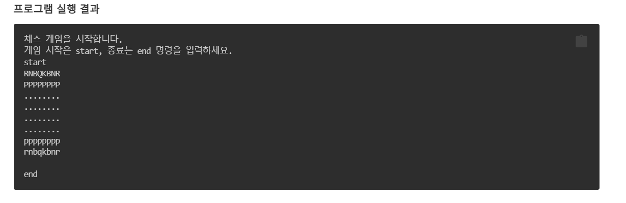 이렇게 간단한 게임 시작 출력문을 띄우고, start를 입력받으면 초기 체스판을 출력하는 것입니다.
