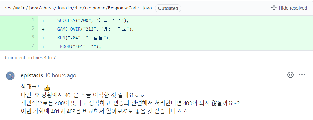 두 번째 수정 사항은 적절한 에러 코드를 사용하라는 것입니다. 저는 400번대가 다 비슷하게 오류와 관련된 처리를 하는 줄 알고 적당한 번호를 써 보았는데, 이 기회에 각각의 에러 코드를 정리하였습니다.