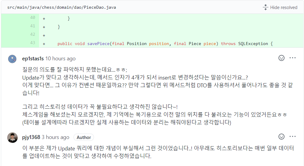 마지막 수정 사항은 Update를 통해 해결했습니다. 저는 Update 쿼리문을 잘 몰랐어서 메소드의 인자가 4개가 필요하다고 생각했는데 그것이 아니었습니다.