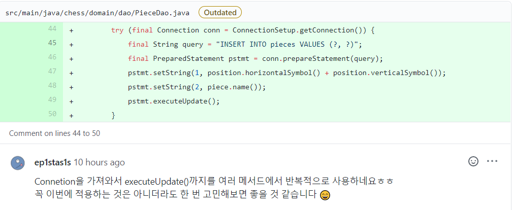 세 번째 수정 사항은 적절한 곳에서 예외를 처리하라는 것입니다. 저는 처음에 예외는 비중을 적게 두고 기능 구현에 초점을 맞춰서 해당 SQLException을 모두 시그니처에 박아뒀습니다. 그러다가 위 피드백을 받고 나서 Dao 단에서는 시그니처를 정의하되, 해당 Dao를 쓰는 곳에서 catch 하도록 수정하였습니다.