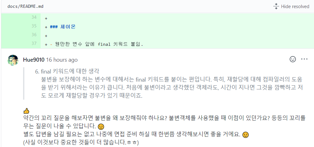 세 번째는 피드백은 아니고, 단순히 제가 fianl을 붙이는 이유에 대해 명확히 알고 있으라고 적어주신 것 같습니다. 이 commet를 바탕으로 불변 객체에 대해 심화 학습할 계획입니다.