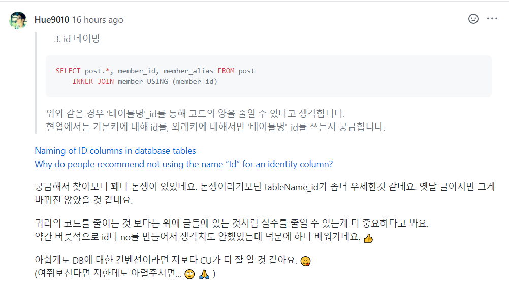 두 번째 피드백은 DB 테이블의 id명에 관한 것인데, 여러 테이블을 다루는 경우에는 tableName_id를 사용하는 것이 적합하다고 판단하였습니다. 그렇다 하더라도 이 부분은 취향 차이이므로 정답은 없다고 생각합니다. 링크 두 개만 공유하겠습니다.