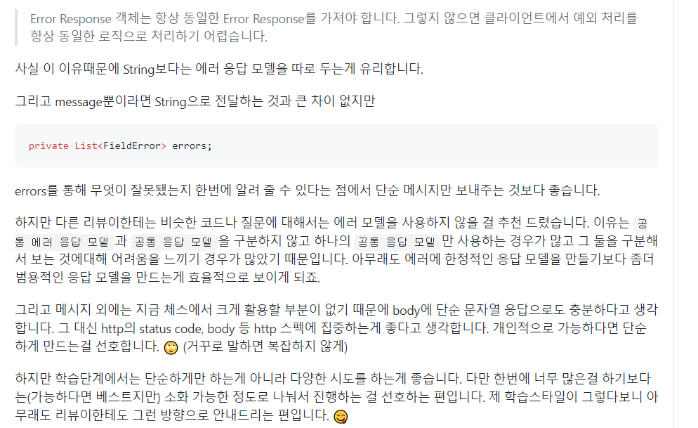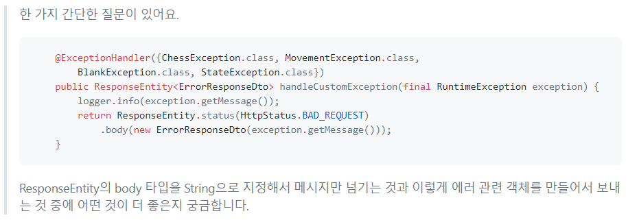 마지막은 저의 개인적인 질문이었습니다. 현재 ResponseEntity의 Body로 ErrorResponseDto를 넘기고 있는데, 해당 객체에는 String 타입의 message만 존재합니다. 이럴 바에는 Body의 단순히 String만 넘기는 것은 어떤지 리뷰어님께 질문하였습니다.