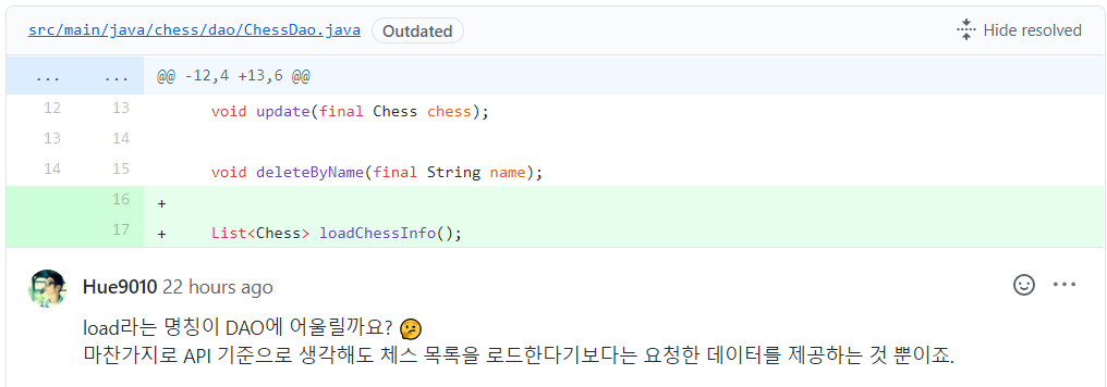 첫 번째 수정 사항은 메소드명을 바꾸는 것입니다. 위와 같이 ChessDao에서 해당 테이블의 모든 값을 가져오는 행위를 load라고 지어주었습니다. 그런데, DAO는 요청한 데이터를 제공하는 것 정도라서 load라는 표현은 좋지 않다고 말씀해주셨습니다. 그래서 find 정도로 수정하였으나, 어떤 기준을 갖고 Dao 메소드명을 지어야하는지 모르겠어서 이 부분은 추가 질문했습니다.