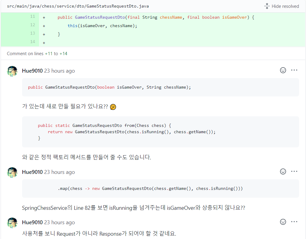 두 번째는 간단 피드백입니다. 먼저, GameStatusRequestDto의 인스턴스 필드는 String chessName과 boolean isGameOver가 있습니다. 그런데 검프가 이전 코드에서 isGameOver와 chessName 순서로 생성자를 만들어 놓았었습니다. 저는 이것이 불편하지만 나머지 코드를 다 바꾸기에는 귀찮아서 chessName과 isGameOver 순서로 생성자를 만들었습니다. 그런데, 이 피드백을 받고 생각해 보니 그럴 필요도 없었습니다. 그냥 불편하더라도 싹 바꾸는 편이 나은 것이죠.
