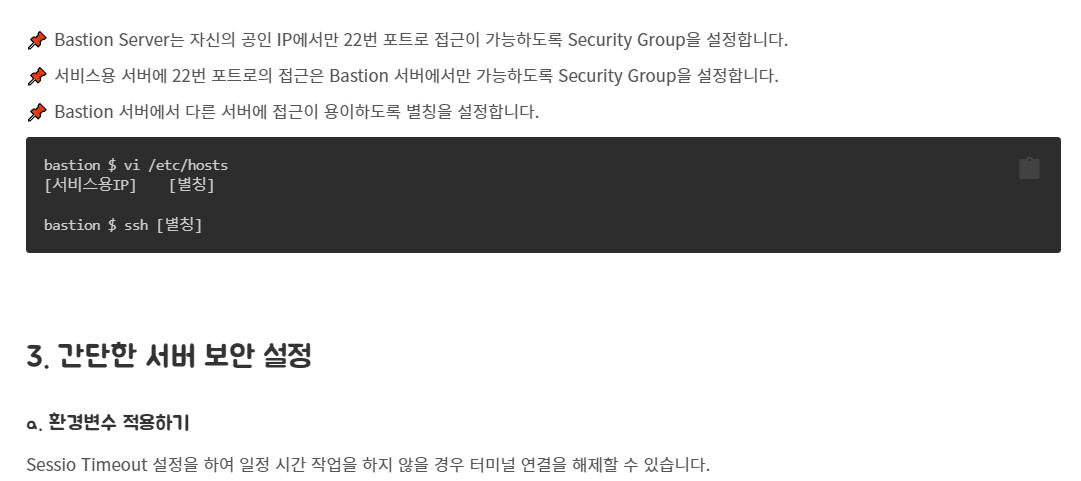 이후에는 bastion에서 서비스로 접속할 때 별칭을 정해주고 서버 보안을 설정하는등, 문서를 그대로 따라가도 문제가 없었습니다. 다만, bastion의 존재 의미를 잘 모르겠고 해당 과정이 실질적으로 배포를 하는데 도움이 되는지 와닿지가 않았습니다.