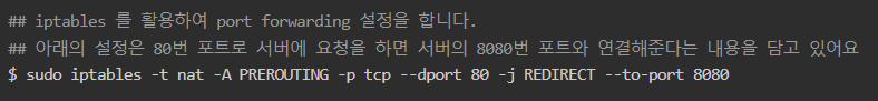 http의 경우 기본 포트가 80번 번호이므로 위 명령어를 입력하면 80번 포트를 자동으로 8080번 포트로 변환해 주는 역할을 합니다. 참고로, https의 경우 기본 포트가 443번입니다.
