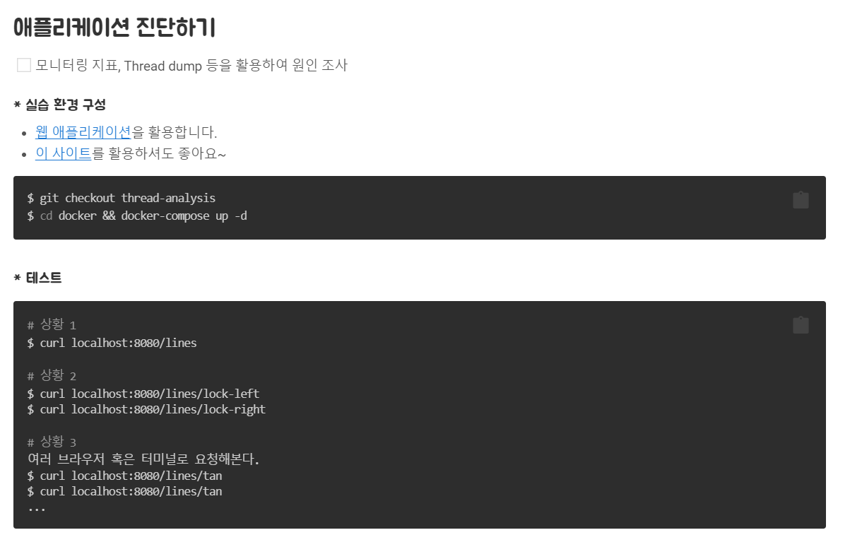 처음에는 특정 애플리케이션을 진단해 보는 것이었습니다. 웹 애플리케이션 하이퍼링크에 들어가서 clone을 받고 상단 명령어 2개를 입력해 보았습니다. 그리고 난뒤 클론해 온 프로젝트를 빌드하고 실행하였습니다. 이후에는 테스크 코드인 curl ~ 명령어를 쳐 보았습니다.