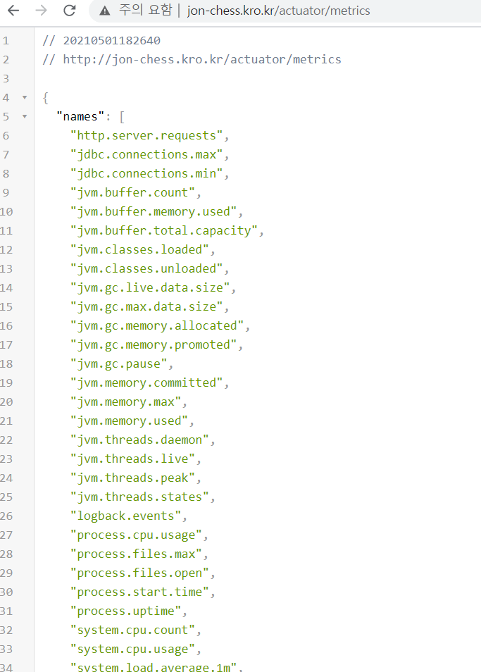 그리고 아무 애플리케이션이나 실행합니다. 저는 이전에 배포했던 체스에 적용했습니다. 우선, "/actuator"를 검색해 봅니다.