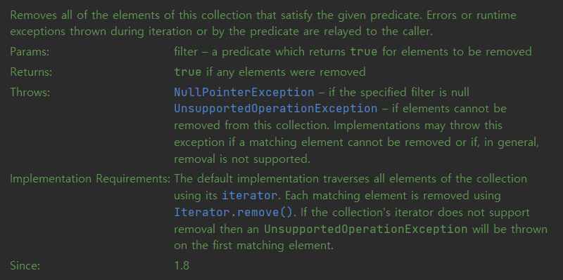 removeIf() 내의 익셉션은 NullPointerException과 UnsupportedOperationException이 있습니다. 전자는 filter가 null일 경우이고, 후자는 해당 컬렉션이 지울 수 없는 경우일 때 발생합니다. 후자가 이해가 잘 가지 않을텐데, unmodifiable과 같은 읽기 타입의 컬렉션이나 Arrays.asList()로 만든 리스트 등에 대해 해당 메소드를 실행하면 UnsuppeortedOperationException이 발생합니다.