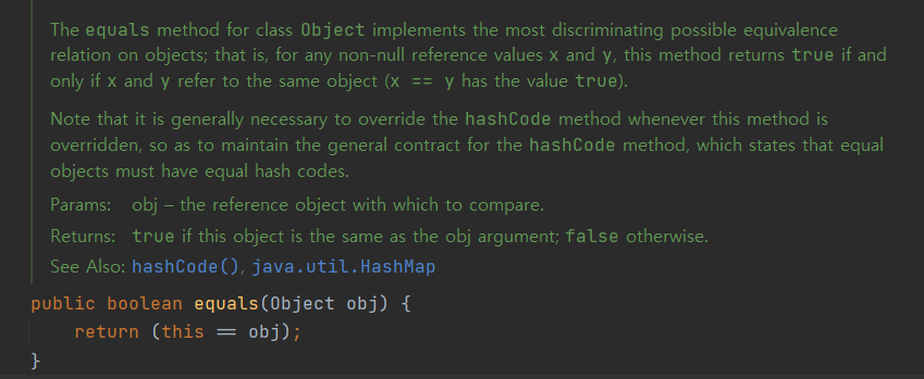 하지만, 배열의 equals()는 ArrayList와는 달리 오버라이딩 없이 Object의 equals()를 사용하는 것을 알 수 있습니다. 결국, ArrayList에서 제가 원하는대로 equals() 비교가 이루어지는 이유는 ArrayList의 equals()가 재정의되었기 때문입니다.