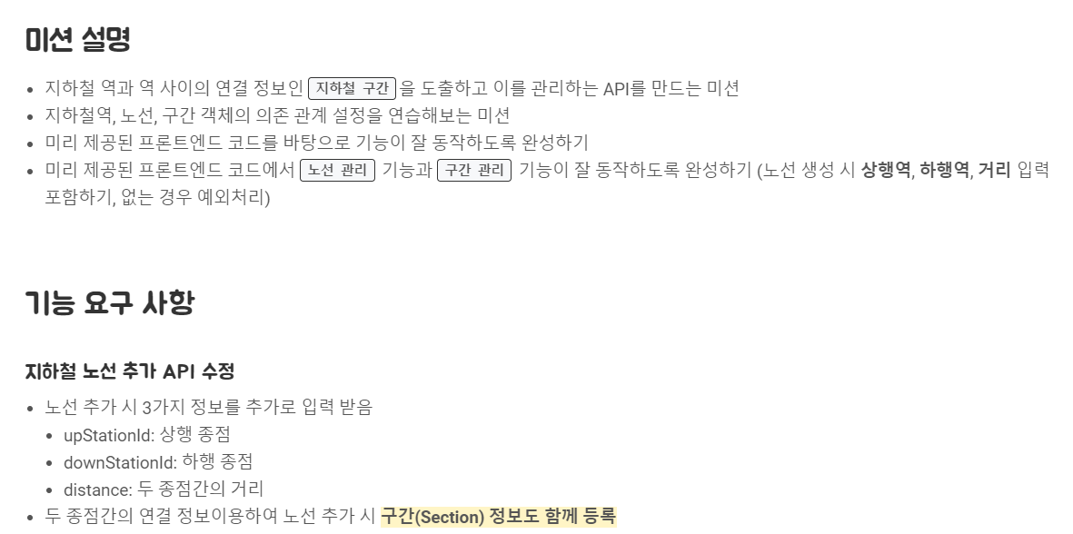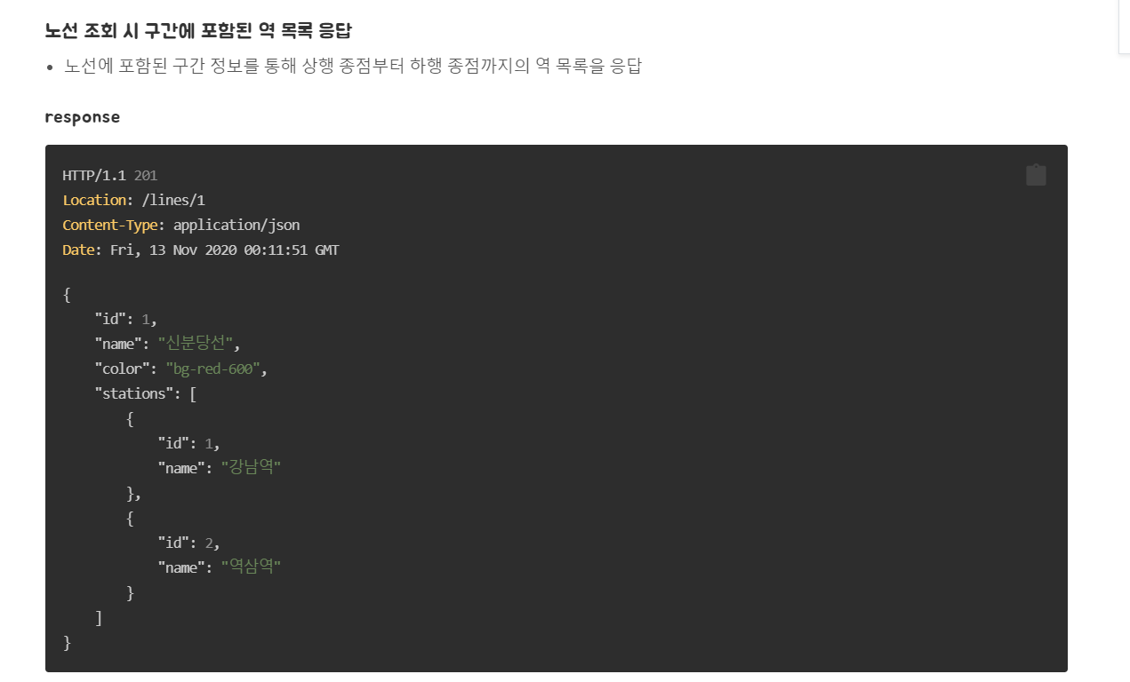 그 외에 구간을 추가하는 API도 만들어야 하고, 아래처럼 노선 조회할 때 지하철역 정보도 함께 보여주어야 합니다.