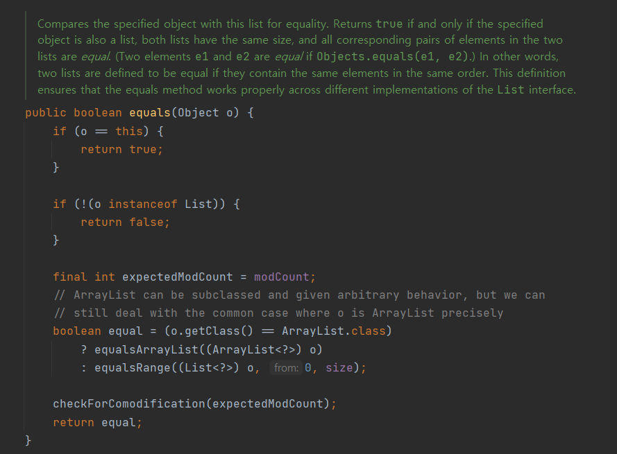위는 ArrayList의 equals() 메소드입니다. 내용을 보면 원소 하나 하나를 비교하는 것을 알 수 있습니다.