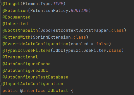 그런데, 잘 보면 저는 테스트 클래스 위에 @JdbcTest만 붙였지, @Transactional은 붙이지 않았습니다. 이것이 가능한 이유는 @JdbcTest을 들어가 보면 알 수 있습니다.