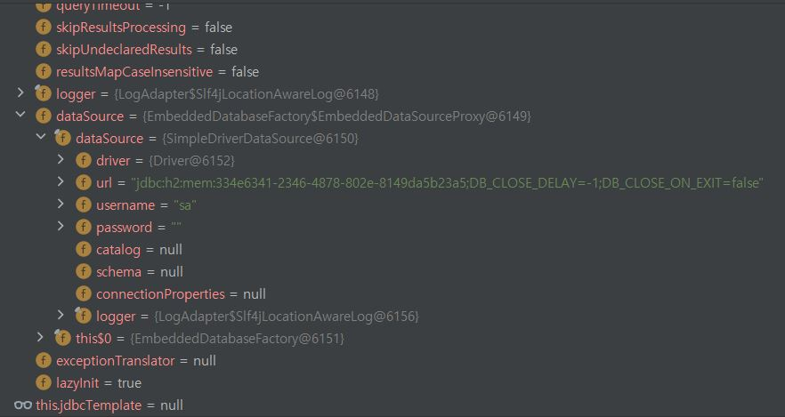 위 사진은 StationDao의 생성자 부분에서 디버그를 찍은 모습입니다. dataSource를 자세히 보시면, url이 'mem:' 뒤에 뭔지 모를 값들이 쭉 나와있는 것을 알 수 있습니다. 하지만, 실제 제 프로덕션의 application.yml을 보면, H2 DB의 url은 'jdbc:h2:mem:testdb'인 것을 확인할 수 있습니다.