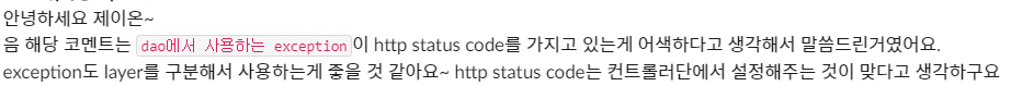 하지만, 이는 제가 잘못 이해한 것이었습니다. 커스텀 익셉션을 만든 것은 좋은데, 그 익셉션은 dao에서 사용하는 것이고, dao에서 사용하는 익센셥이 상태 코드를 갖는 것은 어색한 것이었죠. 그래서 해당 익셉션은 ClientException으로 묶어서 처리할 것이 아니라, 따로 계층을 두는 것이 바람직하다고 합니다. 이 부분은 ControllerAdvice에 또다른 메소드를 두어 처리하려고 합니다만, 중간곰과 내일 이야기를 나누어 볼 계획입니다.