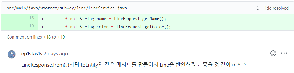 LineRequest 객체에서 name과 color를 받아와서 new 키워드를 통해 Line 객체를 생성하는 것을 알 수 있습니다. 이 변환 책임을 LineRequest에게 주면 코드를 간결하게 할 수 있습니다.