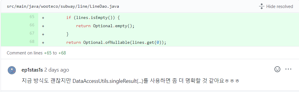 저보다 중간곰의 리뷰가 더 빨리 와서 같이 테스트 코드 위주로 리팩토링을 진행하였습니다. 아무래도 1차적으로 리뷰가 거친 코드다보니까 제 리뷰어인 김고래도 한 번에 merge를 해 주셨습니다. 그래도 몇가지 생각해 볼만한 피드백이 있어서 공유하려고 합니다.