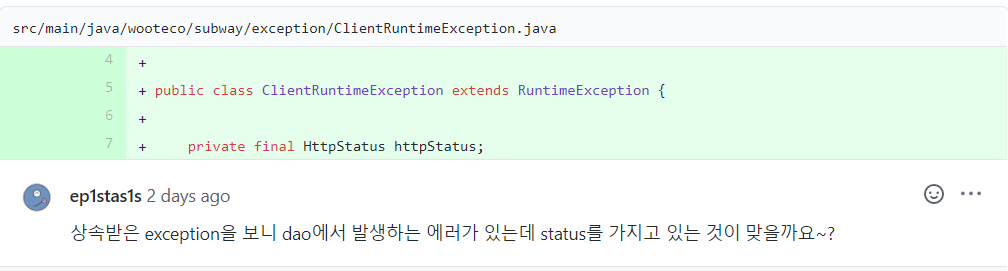 마지막으로, 익셉션의 계층을 나누라는 것입니다. 저는 처음에 이 피드백을 보고, 궁금한 점이 있어서 김고래에게 추가로 질문을 하였습니다.