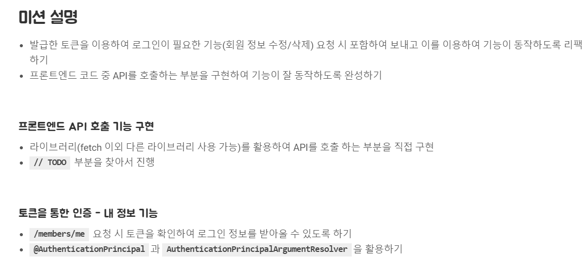 이번 미션도 총 3단계로 구성되어 있으며, 2단계까지는 로그인, 3단계는 경로 조회를 구현해야 합니다. JWT 라이브러리를 활용하여 토근을 발급하고, 해당 API를 호출하는 프론트엔드 코드를 작성하는 것이 1단계 목표였습니다.
