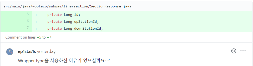 첫 번째 수정 사항은 Wrapper type 대신 Primitive type을 사용하여 변수를 정의하라는 것입니다. 하지만, 저는 리뷰어님의 생각과는 조금 달랐습니다. 위와 같은 id를 Wrapper type으로 정의하게 되면, 초깃값으로 0이 설정되고, DB에는 id가 정의되지 않을 경우 0이 들어갈 것입니다. 이보다는 null로 표현하는 것이 적절하다고 생각하여 저의 생각을 김고래에게 전달하였습니다.