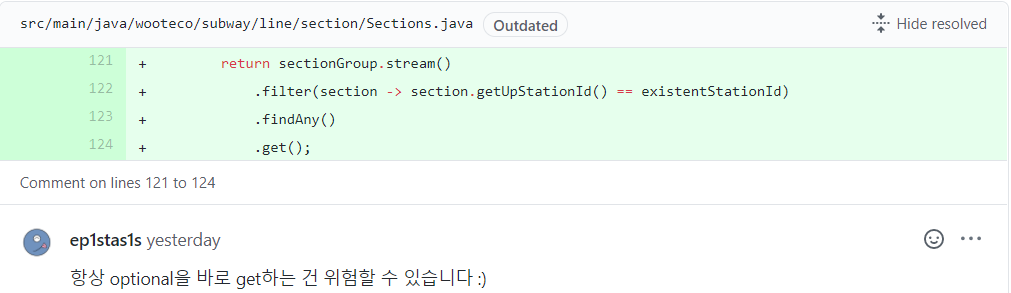 두 번째 수정 사항은 Optional을 바로 get()하지 말라는 것입니다. 이것은 전적으로 저의 실수인데, orElseThrow()를 통해 값이 없으면 익셉션을 반환하도록 수정하였습니다.