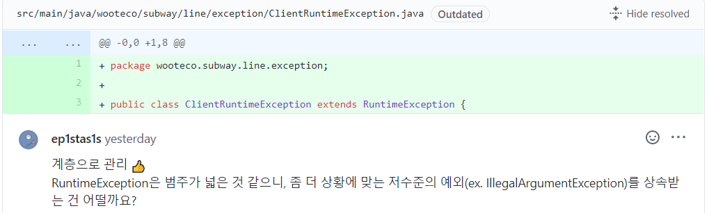 세 번째 수정 사항은 커스텀 익셉션의 상속을 저수준의 예외를 받으라는 것입니다. 이것은 나중에 더 섬세한 계층이 생겼을 때를 대비하여 RuntimeException을 바로 상속받기보다는 IllegalArgumentException과 같은 저수준의 예외를 상속받으라는 것으로 판단하여 수정했습니다.