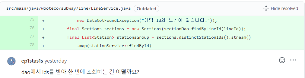 마지막 수정 사항은 DAO에서 Station ID들을 받아서 Station List를 만들어 반환하라는 것입니다. 어떻게 해야할 지 바로 떠오르지는 않아서 가장 쉬운 방법을 사용해 보았습니다.