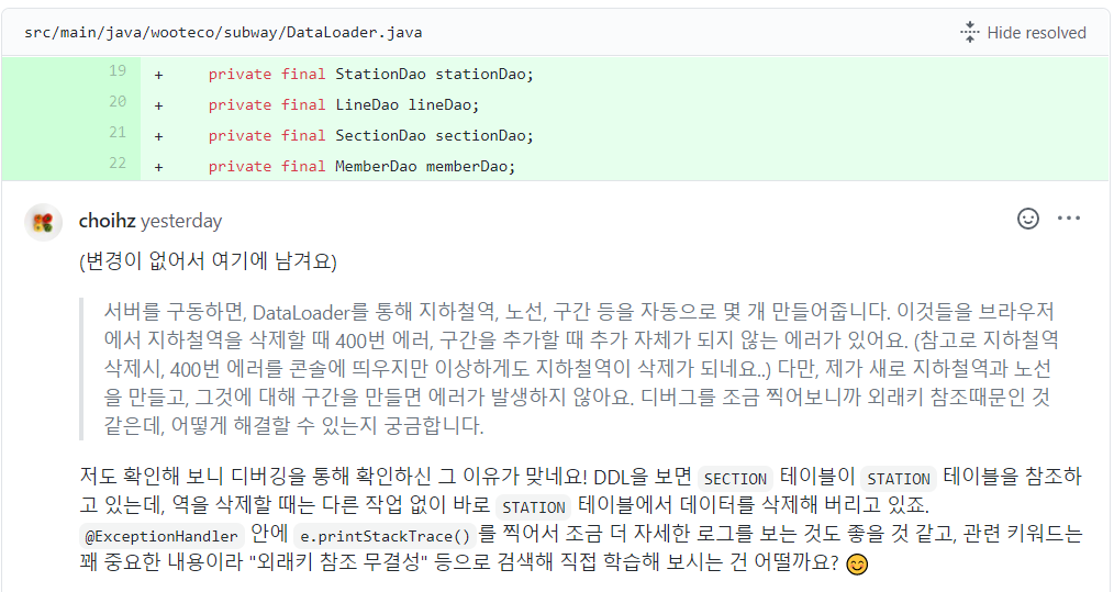 네 번째 수정 사항은 외래키 참조 무결성을 지키라는 것입니다. 현재, 테이블을 보면 SECTION 테이블이 STATION 테이블을 참조하고 있으므로 역을 다이렉트로 삭제하면 외래키 참조 무결성이 발생합니다. 따라서, 해당 STATION을 지우기 전에 STATION이 있는 구간을 지워 주어야 합니다. 이 부분은 원래 우테코에서 주어진 코드가 다소 복잡해서 구현하기는 힘들었습니다.