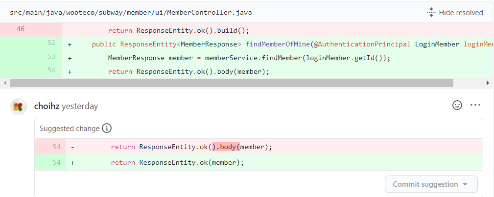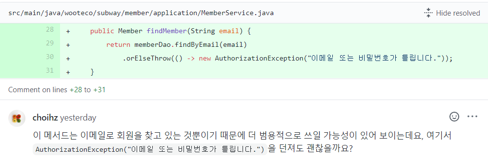 두 번째 수정 사항은 코니에게 DM을 보내 보니까 적절한 곳에서 예외를 처리하라고 답변받았습니다. 현재 해당 메소드는 MemberService에서 쓰이고 있는데, 인증 관련 에러가 발생하는 것이 어색하기 때문이죠. 따라서 해당 메소드의 반환 타입을 Member가 아니라 Optional<Member>로 바꾸고 이 메소드를 사용하는 외부(Auth)에서 orElseThrow() 사용하도록 수정하였습니다.