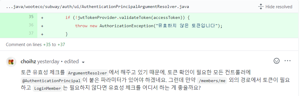 위 피드백을 반영하기 전에 제가 짰던 코드의 문제점을 먼저 말씀드리겠습니다. 현재는 인터셉터라는 것 없이 리졸브 단에서만 토큰 유효성을 검증하고 LoginMember를 반환합니다. 또한, 이 리졸브를 통해 토큰의 유효성을 검증하는 것은 오로지 컨트롤에 @AuthenticationPrincipal이 붙은 파라미터가 있어야만 가능합니다. 즉, 로그인 이후 사용할 수 있는 컨텐츠(역 관리, 노선 관리, 구간 관리 등)에 대해서 비로그인 유저도 사용할 수 있게 됩니다. 왜냐면 역, 노선, 구간 관련 컨트롤러에는 @AuthenticationPrincipal이 붙은 파라미터가 없기 때문이죠. 그렇다고 해당 컨트롤러들에 이 어노테이션을 달아서 리졸브에게 LoginMember를 반환해 달라고 요청하는 것도 부적절합니다.