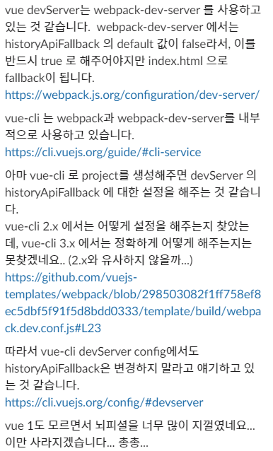 그런데, 여기서 제가 이해가 가지 않는 상황을 겪었습니다. 바로, vue.config.js 단에서 historyApiFallback이 없어도 404 에러가 발생하지 않고, index.html이 렌더링된다는 점이죠. 그래서 vue 프로젝트가 생성될 때 자동으로 이 옵션을 걸어주는 것인지에 대한 추측만 있을 뿐이었습니다. 'vue default historyApiFallback'과 같은 키워드로 구글링하였으나 명확한 정보를 얻지는 못해서 우테코 프론트엔드 크루들에게 질문하였습니다.