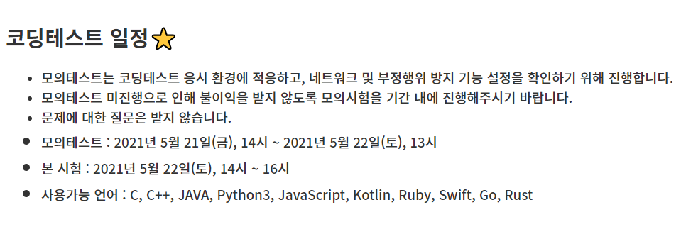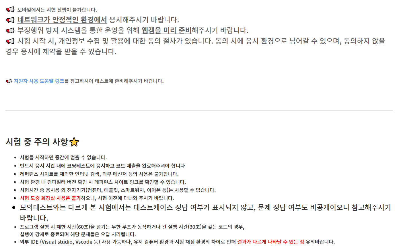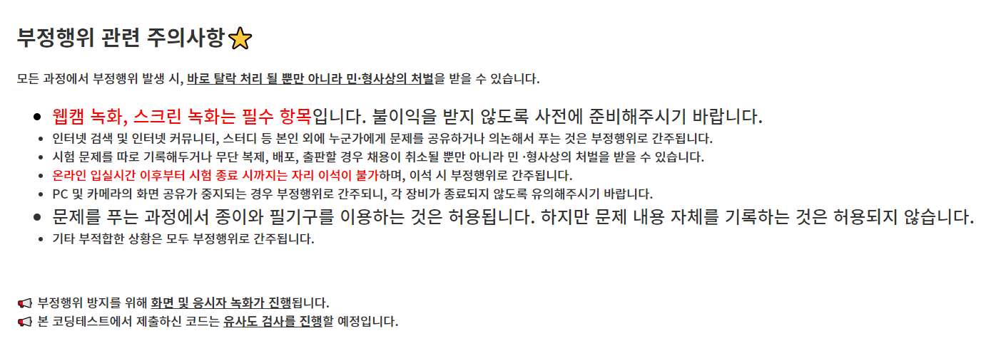 주의 사항이 여러 가지 있는데, 핵심이 되는 사항은 부정 행위입니다. 부정 행위 방지를 위해서 웹캠을 켜야하고, 스크린을 녹화해야 했습니다. 물론, 스크린은 구름 플랫폼에서 알아서 녹화해주므로 웹캠만 있으면 됩니다. 그리고 래퍼런스 사이트 외에 어떠한 자료도 참고할 수 없으며, 전자기기도 사용이 불가했습니다. 다만, 외부 IDE를 사용할 수 있다는 점은 다행이었습니다.