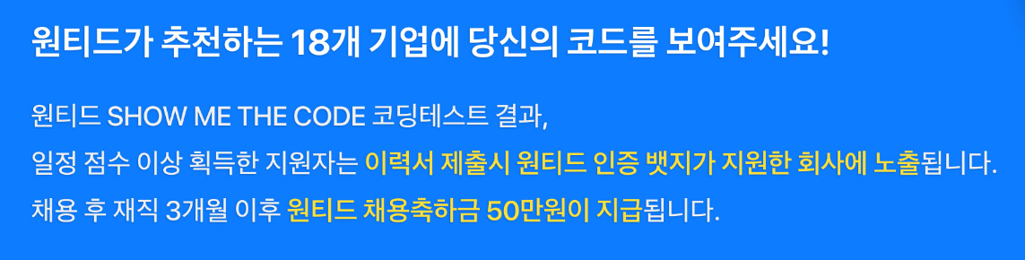 데브 카니발은 코딩 테스트에서 일정 점수 이상 획득한 지원자에게 인증 뱃지를 부여합니다. 그리고 특정 기업에 채용 성공한 지원자는 채용 축하금 50만원까지 지급된다고 합니다.