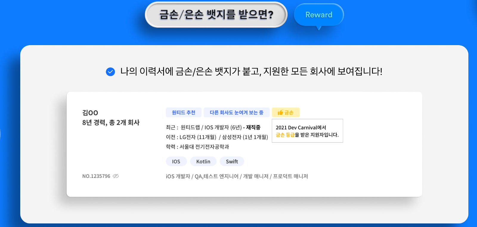 뱃지는 금손과 은손 뱃지가 있으며, 위와 같이 이력서 상단에 콕 박힌다고 합니다. 남들과 다르게 이런 뱃지가 있다면 어느 정도 메리트가 있겠죠?