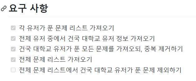 결국 핵심은 '전체 문제 리스트에서 건국 대학교 유저가 푼 문제 제외하기'지만, 그 전 과정을 차례대로 수행할 수 있어야 했습니다. 오늘은 로직에 대한 설명보다는 구현 중에 막히거나 새롭게 알게된 부분을 위주로 기록하려고 합니다.