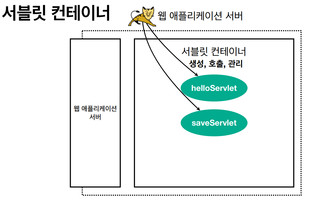 서블릿 컨테이너는 구현되어 있는 Servlet 클래스의 규칙에 맞게 서블릿 객체를 생성, 초기화, 호출 종료하는 생명 주기를 관리합니다. 톰캣처럼 서블릿을 지원하는 WAS를 서블릿 컨테이너라고 할 수 있습니다.