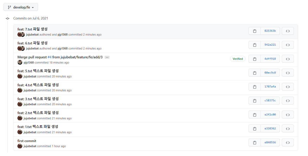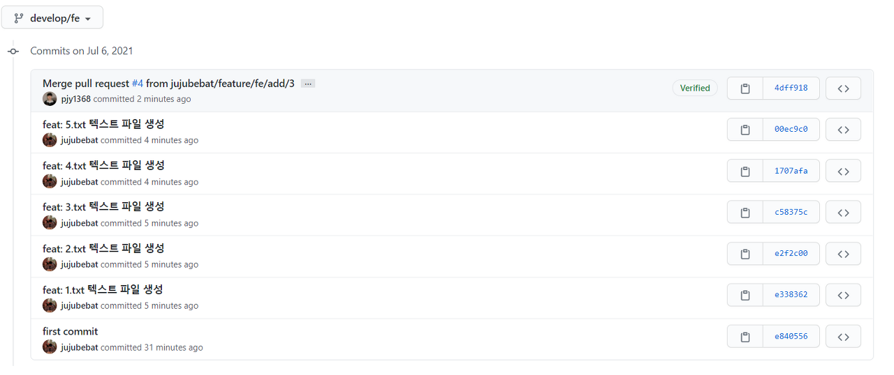 이런 식으로 'feature/fe/add/3' 브랜치에서 작성한 커밋들을 모두 가져 오고 마지막에 'Merge pull ~' 내용이 있는 커밋이 생깁니다.