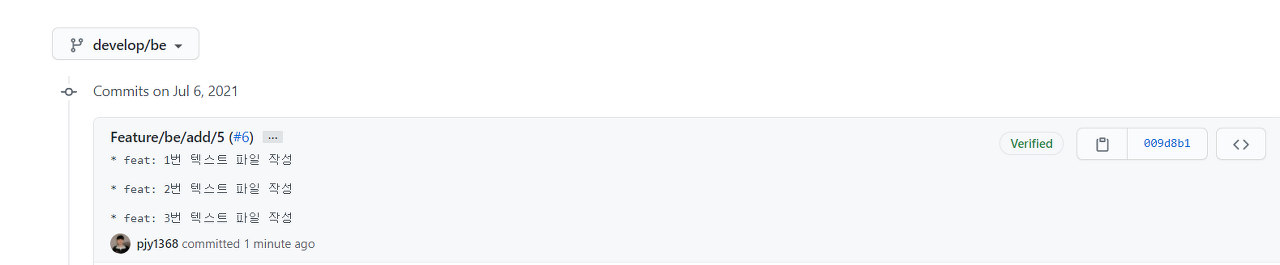 이런 식으로 'feature/be/add/5' 브랜치에 있던 커밋들이 하나의 커밋으로 묶여서 생깁니다. 개인적으로 feature 브랜치에서 develop 브랜치로 merge를 해야할 때는 squash and merge 방식이 적합하다고 생각합니다. 왜냐하면 develop 브랜치는 기능 단위 커밋이 필요한 것이지, 하나의 기능을 구현하기 위한 세부 커밋들까지 모두 가지고 있을 필요는 없다고 생각하기 때문입니다.