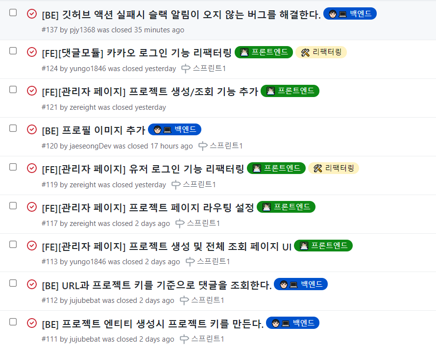 우리 저장소에서는 위와 같이 이슈에 백엔드/프론트엔드 라벨을 붙여서 어떠한 팀에서 구현한 기능인지 명시해 주고 있습니다. 하지만, 그렇게 중요하다고 판단하지 않아서 실수로 빼 먹는 경우가 잦습니다. 그래서 이것도 자동화할 수 없을까 생각했고, 구글링하다보니 이 기능을 제공하는 라이브러리를 찾았습니다. 다만, 처음 보는 속성이 많이 보여서 약간의 학습을 한 다음 적용해야겠습니다.