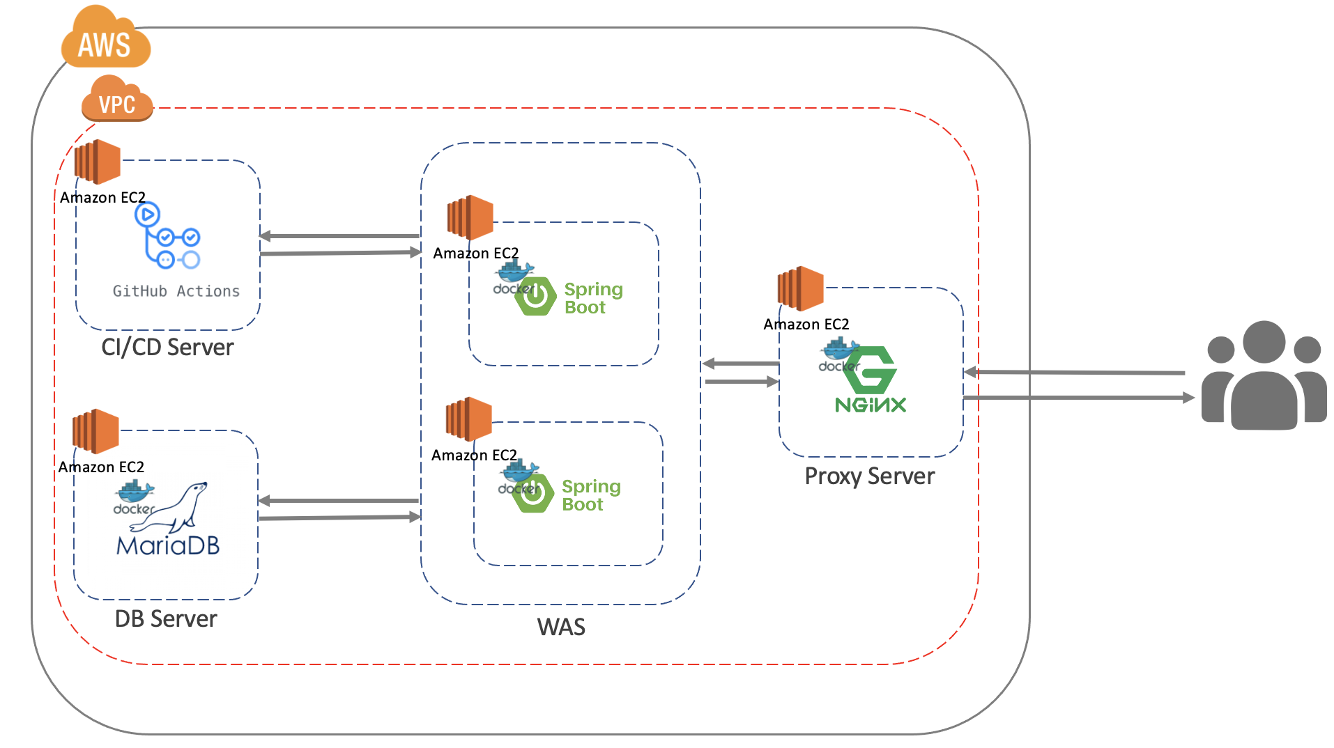 위 그림은 우리 프로젝트의 아키텍쳐입니다. 여기서 잘 보시면 나머지는 모두 도커로 관리되는데 Github actions 호스팅 서버는 도커로 관리되지 않고 있습니다. 일단 이 기능 자체가 저에게 매우 생소해서 도커고 뭐고 기능 구현에 초점을 맞췄기 때문이죠.