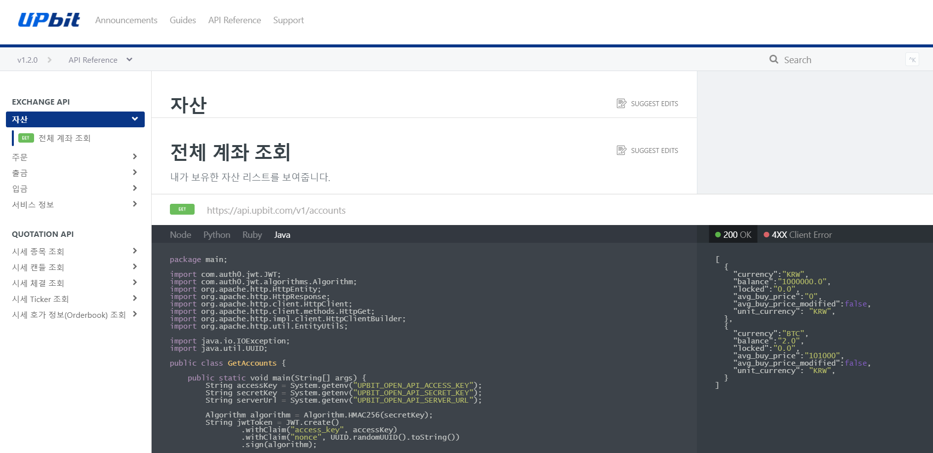 전체 계좌를 조회하기 위해서는 GET 방식으로 JWT 토큰을 담아서 'https://api.upbit.com/v1/accounts'로 요청을 보내면 됩니다. 그리고 아래는 업비트에서 제공하는 Java 예제 코드입니다.