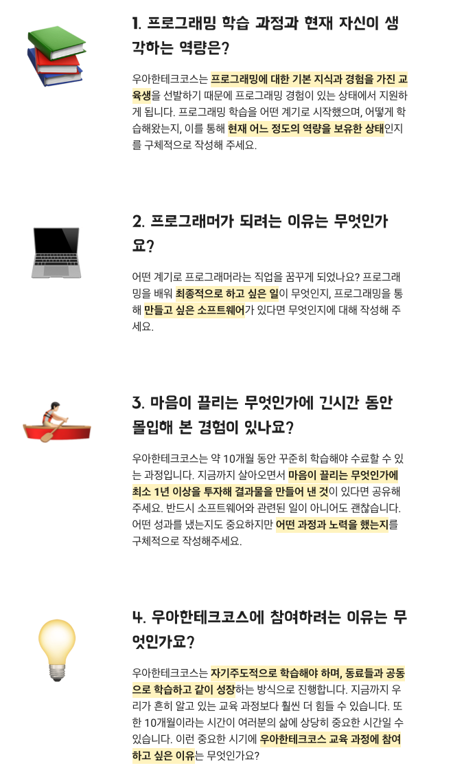 디테일한 자기 소개서 문항을 설명드릴 수는 없지만, 우테코 홈페이지에 나와 있는 대로 아래 4가지 질문을 바탕으로한 문항으로 나옵니다.