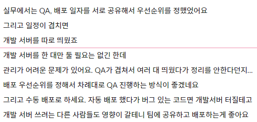 그러나, 이 방식도 Github-flow의 2번째 단점이 존재했습니다. 빠른 호흡으로 배포를 가져가는 것은 좋지만, 중간에 최소한 실제 환경에서 테스트를 해야 한다고 생각합니다. 아무래도 다들 실무 경험이 없기 때문에 이러한 고민에 대해서 우아한테크코스 구구 코치님과 힐링페이퍼 이규원 CTO 님께 조언을 구했습니다.