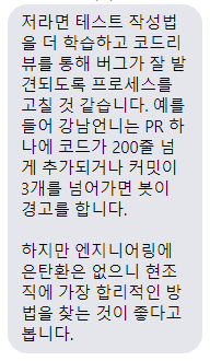 힐링페이퍼 이규원 CTO님께서는 테스트 기법을 더욱 익혀서 테스트를 견고하게 만들고, 코드 리뷰를 통해 버그를 더 잘 잡을 수 있도록 프로세스를 개선하라고 말씀해 주셨습니다. 이어서, 힐링페이퍼는 PR을 날릴 때 커밋이 3개가 넘어가거나 수정된 코드의 양이 200줄이 넘어가면 bot이 경고를 주고 있다고 합니다.