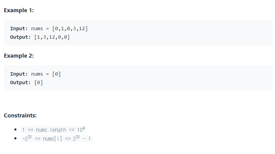 맨 뒤에 부터 한 칸씩 앞쪽으로 탐색하면서 0일 경우에는 해당 요소와 그 다음 요소를 맨 뒤까지 스왑하면 됩니다.