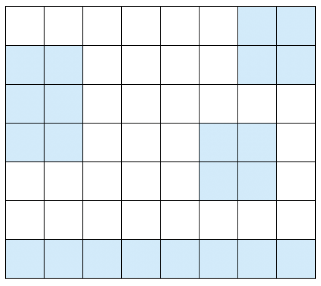 섬은 연결된 땅이 상하좌우로 붙어있는 덩어리를 말하고, 아래 그림은 네 개의 섬으로 이루어진 나라이다. 색칠되어있는 칸은 땅이다.