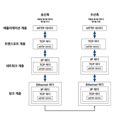 TCP/IP로 통신할 때 계층을 순서대로 거쳐 상대와 통신한다. 송신하는 측은 애플리케이션 계층부터 내려가고, 수신하는 측은 네트워크 계층부터 올라간다. 송신할 때는 각 계층을 통과하며 헤더에 필요한 정보가 추가되고, 수신할 때는 계층마다 사용한 헤더가 삭제된다.