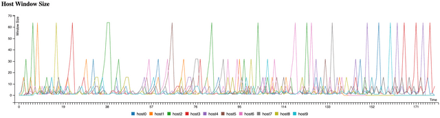 위 그래프에서 청록색 선은 송신 측의 혼잡 윈도우 크기를, 굵은 검정선은 ssthresh 값을 보여주고 있다. 이 시나리오에서 송신 측의 혼잡 윈도우 크기는 8로 초기화 되었고, 그에 따라 ssthresh는 4로 설정되어 있다.