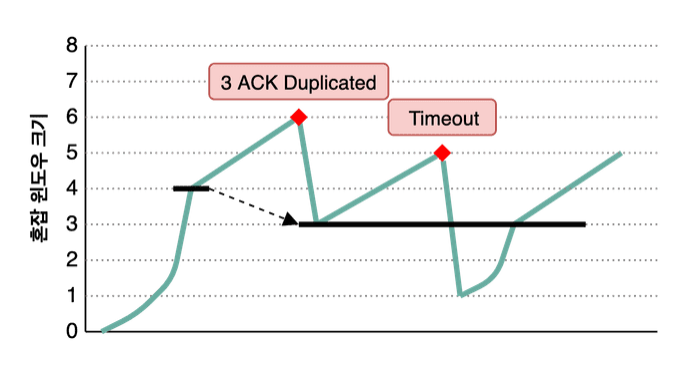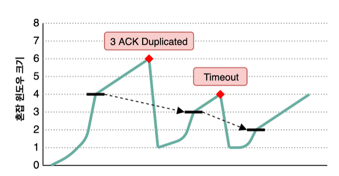 송신 측은 임계점을 만나기 전까지 Slow Start 방식을 사용하여 자신의 윈도우 크기를 증가시키다가 ssthresh를 넘어선 이후부터는 선형적으로 증가시키고 있다. 이 상황에서 3 ACK Duplicated나 Timeout과 같은 혼잡 상황을 만나면 어떻게 될까?